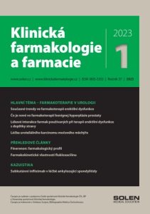 HLAVNÍ TÉMA – FARMAKOTERAPIE V UROLOGII Současné trendy ve farmakoterapii erektilní dysfunkce Čo je nové vo farmakoterapii benígnej hyperplázie prostaty Lékové interakce farmak používaných při terapii erektilní dysfunkce s doplňky stravy Léčba uroteliálního karcinomu močového měchýře PŘEHLEDOVÉ ČLÁNKY Finerenon: farmakologický profil Farmakokinetické vlastnosti flukloxacilinu KAZUISTIKA Subkutánní infliximab v léčbě ankylozující spondylitidy www.solen.cz | www.klinickafarmakologie.cz | ISSN1803-5353 | Ročník 37 | 2023 Klinická farmakologie a farmacie 2023 Časopis je vydáván s podporou České společnosti klinické farmakologie ČSL JEP a Slovenskej spoločnosti klinickej farmakológie. Časopis je indexován v: Embase, Scopus, Bibliographia Medica Čechoslovaca.