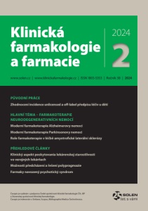 PŮVODNÍ PRÁCE Zhodnocení incidence unlicensed a off-label předpisu léčiv u dětí HLAVNÍ TÉMA – FARMAKOTERAPIE NEURODEGENERATIVNÍCH NEMOCÍ Moderní farmakoterapie Alzheimerovy nemoci Moderní farmakoterapie Parkinsonovy nemoci Role farmakoterapie v léčbě amyotrofické laterální sklerózy PŘEHLEDOVÉ ČLÁNKY Klinický aspekt poskytovania lekárenskej starostlivosti vo verejných lekárňach Možnosti předcházení a řešení polypragmazie Farmaky navozený psychotický syndrom www.solen.cz | www.klinickafarmakologie.cz | ISSN 1803-5353 | Ročník 38 | 2024 Klinická farmakologie a farmacie 2024 Časopis je vydáván s podporou České společnosti klinické farmakologie ČSL JEP a Slovenskej spoločnosti klinickej farmakológie. Časopis je indexován v: Embase, Scopus, Bibliographia Medica Čechoslovaca.